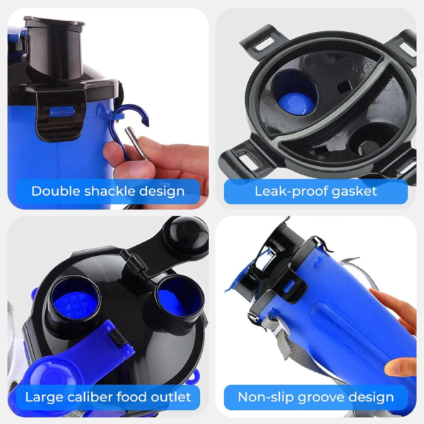 - Dual-Use Design: Designed with two chambers in one bottle, one for dry food and the other for water. With two wide-mouth snap lids on the top of the cap, easy for dispensing snacks or pouring water.