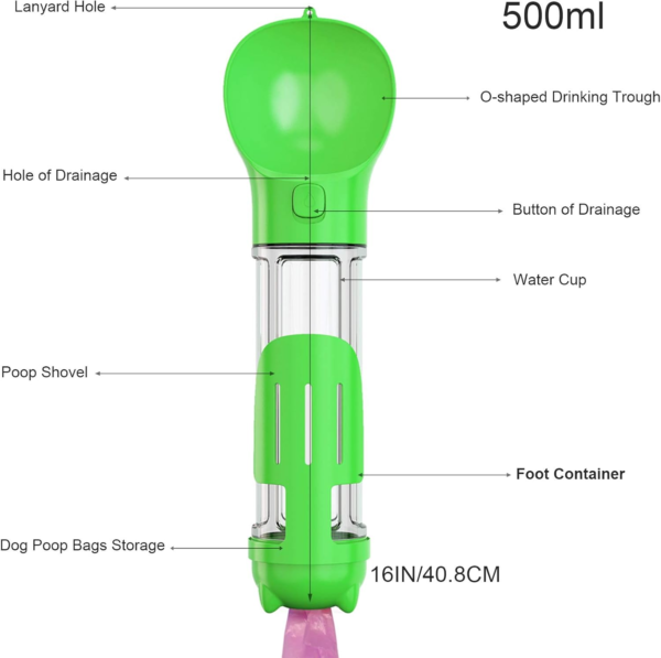 - Multifunctional Design: This dog water bottle is of integrated design, with a storage capacity of 500ml. Our multi-functional dog water bottle is made of high-quality food-grade ABS + PC plastic and does not contain BPA, including drinking bowl, water bottle, food container, garbage bag, and stool shovel.