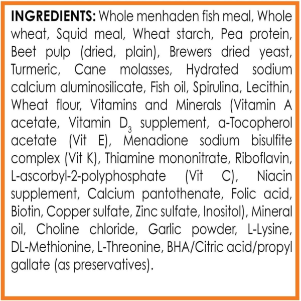 - Includes spirulina algae, menhaden and squid for vibrant colors and optimal growth