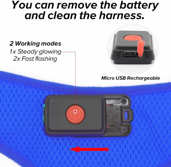 - 2 MODES GLOWING LIGHT — The light mode can be changed by clicking the switch button. Charging 2 hours could last 8 hours for the blink model or 4 hours for a steady glow. Our light-up dog harness can track your pet dog when walking at night.
