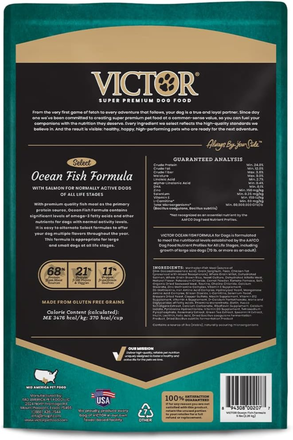SELECT – OCEAN FISH FORMULA: Formulated for normally active dogs of varying breeds and sizes through all life stages, this dog food is an excellent choice for dogs that may be allergic to select meat proteins. This nutrient-dense dry dog food contains premium-quality fish meal as its primary protein source, plus salmon, and the super premium dog food is fortified with vitamins, minerals, Omega-3 fatty acids, protein and amino acids, and promotes healthy immune and digestive systems while supporting a healthy skin and coat. This adult and puppy dog food is a dry kibble with 24% protein and 12% fat, and is 3476 KCAL/KG or 370 KCAL/CUP. The protein in this nutrient-rich dog food comes from meat sources (68%), plants and veggies (21%), and gluten free grain sources (11%). VICTOR Ocean Fish dog food is part of our Select line, which is formulated to offer specific proteins in a variety of formulated blends. With scientifically advanced and nutritionally complete ingredients, this fish protein dog food is formulated to maintain healthy weight and help sustain energy levels. We proudly produce every bag of VICTOR dry kibble in our own Texas-based facility, and each ingredient used is carefully selected and serves a nutritional purpose. A majority of the ingredients in our super premium quality dog foods come from ranches, farms and other trusted suppliers who are within a day’s drive of our East Texas plant. Every VICTOR dog kibble formula is created with our proven VPRO Blend of ingredients – an exclusive mix designed by industry-leading experts to promote immune system function and healthy skin and coat for every dog, regardless of breed, age, or activity level. And the result is visible: healthy, happy pets who are ready for the next adventure.